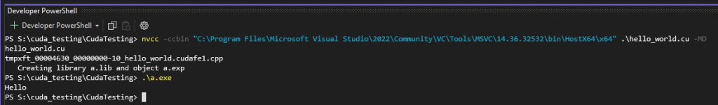 nvcc -ccbin "C:\Program Files\Microsoft Visual Studio\2022\Community\VC\Tools\MSVC\14.36.32532\bin\HostX64\x64" .\hello_world.cu -MD